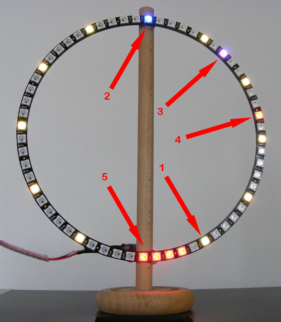 Auf einem Ring aus 60 RGB-Leuchtdioden werden alle Zeiger und Markierungen angezeigt: zwölf gelbe Markierungen für die Stundenstriche (1), ein blauer Stundenzeiger (2), ein weißer Minutenzeiger (3), ein roter Sekundenzeiger (4) und ein angedeutetes Pendel (5) aus vier roten LEDs.