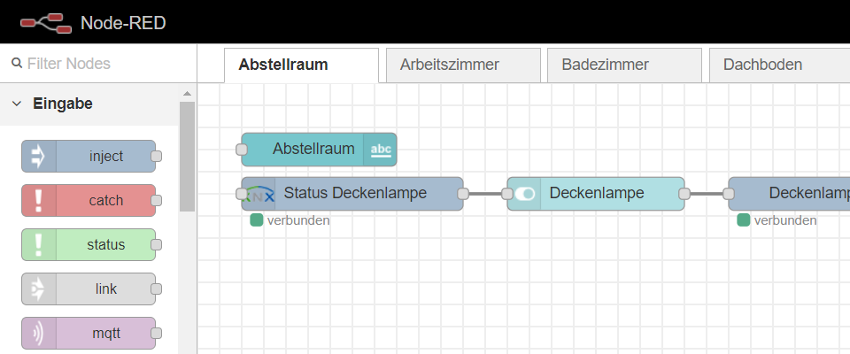 Mit Node-RED können in einem Flow unterschiedliche Eingabe-, Ausgabe- und Verarbeitungs-Nodes miteinander verbunden werden. Dadurch lassen sich verschiedene Dinge kontrollieren und steuern. Jeder Knoten hat eine festgelegte und eindeutige Aufgabe. Werden an einen Knoten Daten übermittelt, so kann der Knoten diese Daten verarbeiten und an den nächsten Knoten weitergeben.