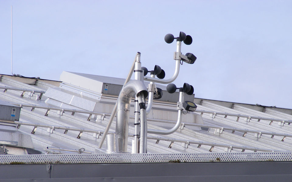 Das nenne ich redundante Technik: 3 Windmesser (Anemometer) und 3 Regensensoren nebeneinander.