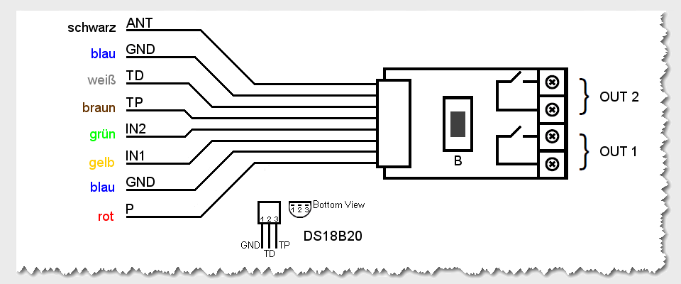 Dieser kleine Sensorbaustein (14.5 mm x 27.3 mm x 12 mm) hat zwei potentialfeie Binäreingänge, einen 1-Wire-Digitaleingang für bis zu vier Temperatursensoren vom Typ DS18B20 und zwei potentialfreie Ausgänge, die, allerdings nur abhängig von den beiden Eingängen, durchschalten. Der Versorgungsspannungsbereich ist weit gefasst und liegt zwischen 9 und 30 Volt Gleichspannung.